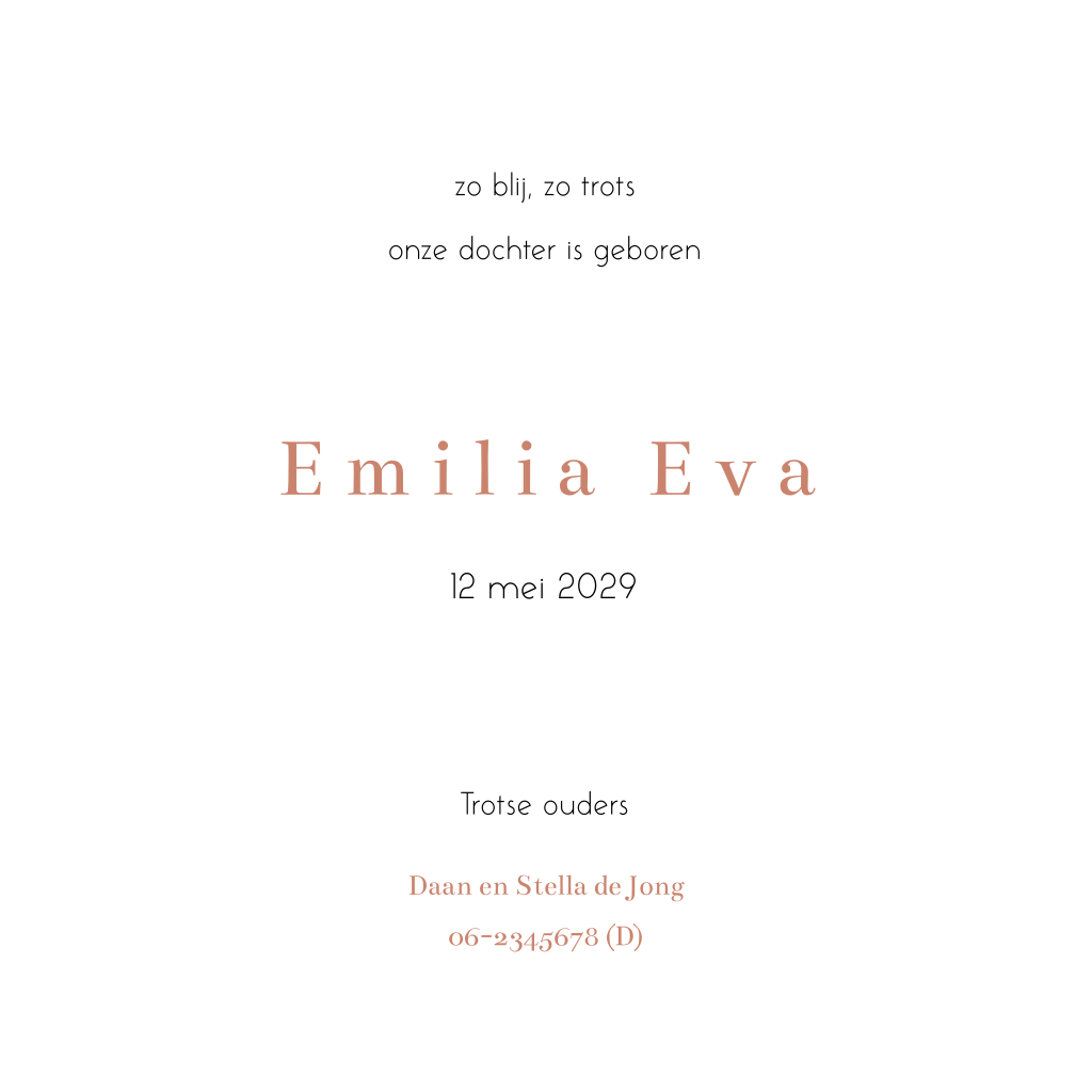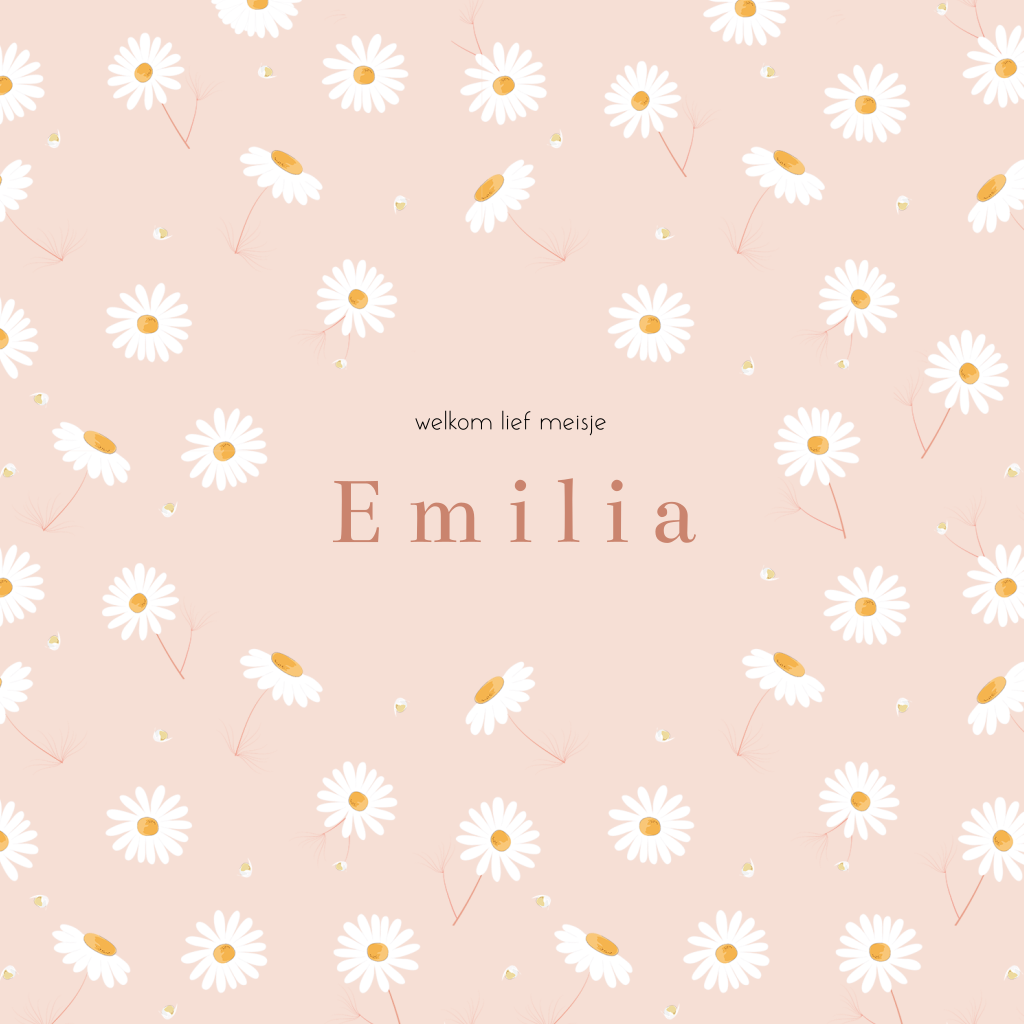 Hoera, het is lente! Madeliefjes bloeien voornamelijk in het voorjaar, dus wordt jouw kindje in deze periode geboren? Dan is dit roze geboortekaartje vol met witte madeliefjes perfect om de geboorte van jouw dochter aan te kondigen. Je kunt het kaartje zelf online bewerken met de editor, pas de achtergrondkleur aan en de teksten en bestel een proefdruk.