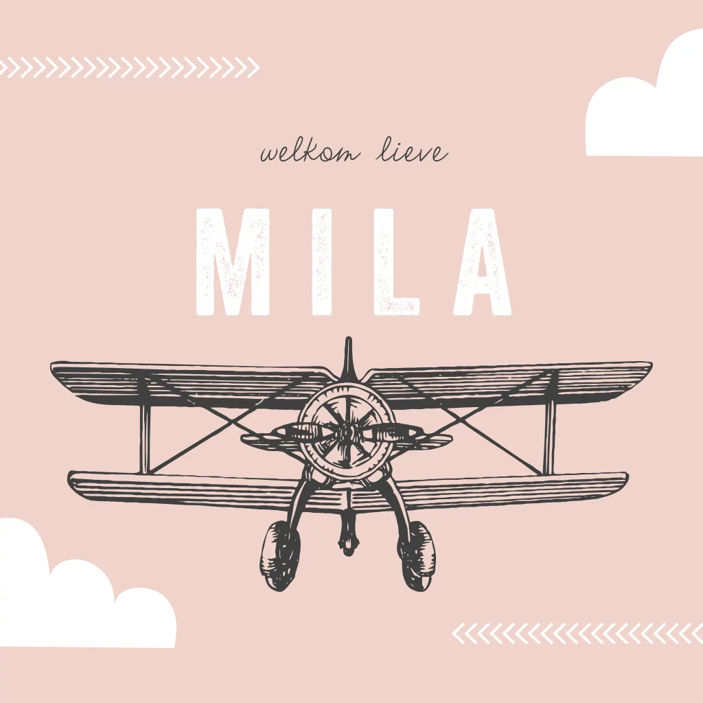 Retro geboortekaartje voor een meisje met vintage illustratie van een dubbeldekker vliegtuig op roze achtergrond. Zijn jullie fan van vliegtuigen? Dan is dit een erg leuk geboortekaartje voor de geboorte van jullie dochter. De naam staat in een stoer lettertype boven het vliegtuigje.