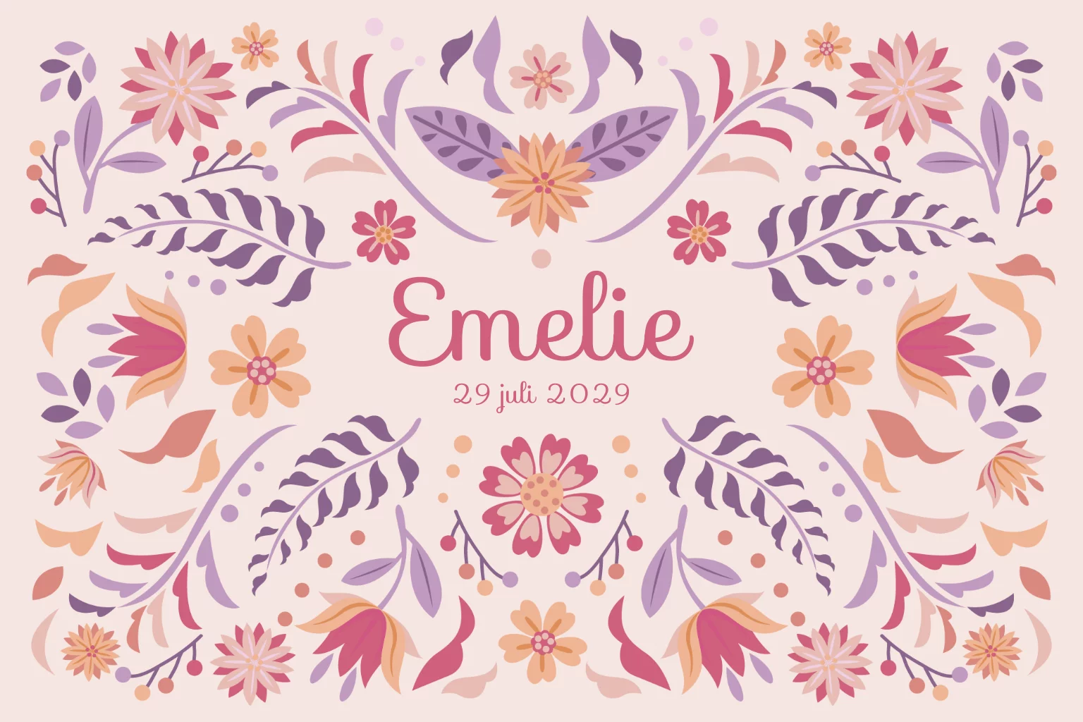 Vier de komst van je kleine meid met dit prachtige roze geboortekaartje met symmetrische bloemenmotieven in roze, oranje en paars. Pas het ontwerp eenvoudig aan in onze editor en bestel een proefdruk van dit retro geboortekaartje om het eindresultaat eerst even te zien.