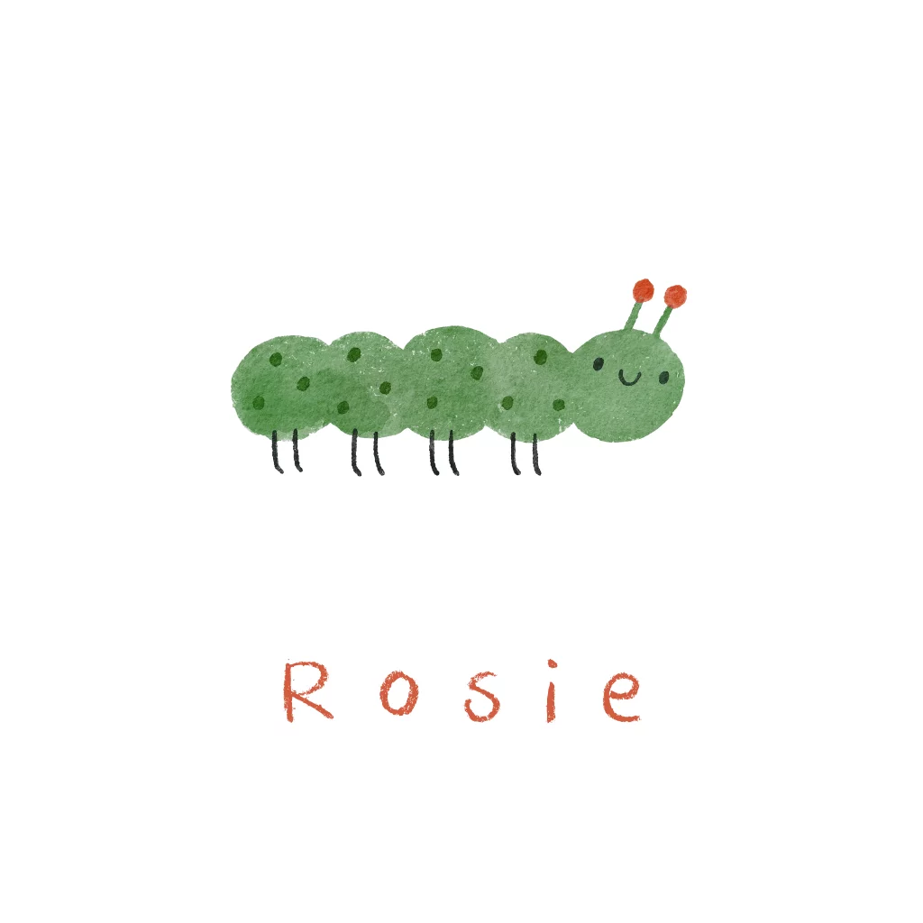 Uniek geboortekaartje met een vrolijke, groene rups in waterverf op een witte achtergrond. De illustratie straalt speelsheid en zachtheid uit, perfect voor een meisje. De naam staat onder de rups in een handgetekend lettertype. Dit dieren geboortekaartje is ideaal voor ouders die op zoek zijn naar een minimalistisch geboortekaartje meisje met een creatieve twist.
