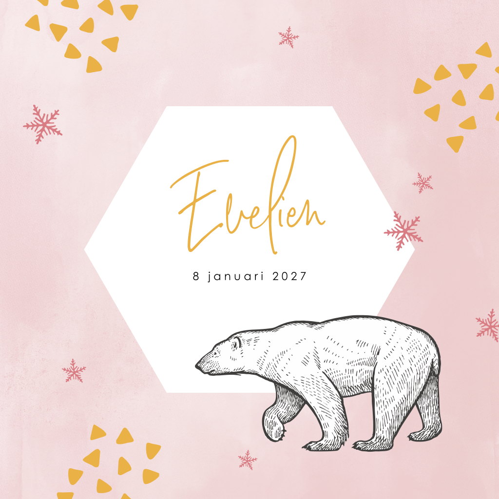 Scandinavisch geboortekaartje met zeshoek, driehoekjes en ijsbeer. Leuk ontwerp met zeshoek en verschillende driehoekjes in de kleuren geel en lichtroze. Op de voorkant staat een grote getekende ijsbeer. De kaart wordt versierd met roze ijssterren, een perfect kaartje voor een winterkindje dus! In de kaart kun je alle geboortegegevens kwijt.