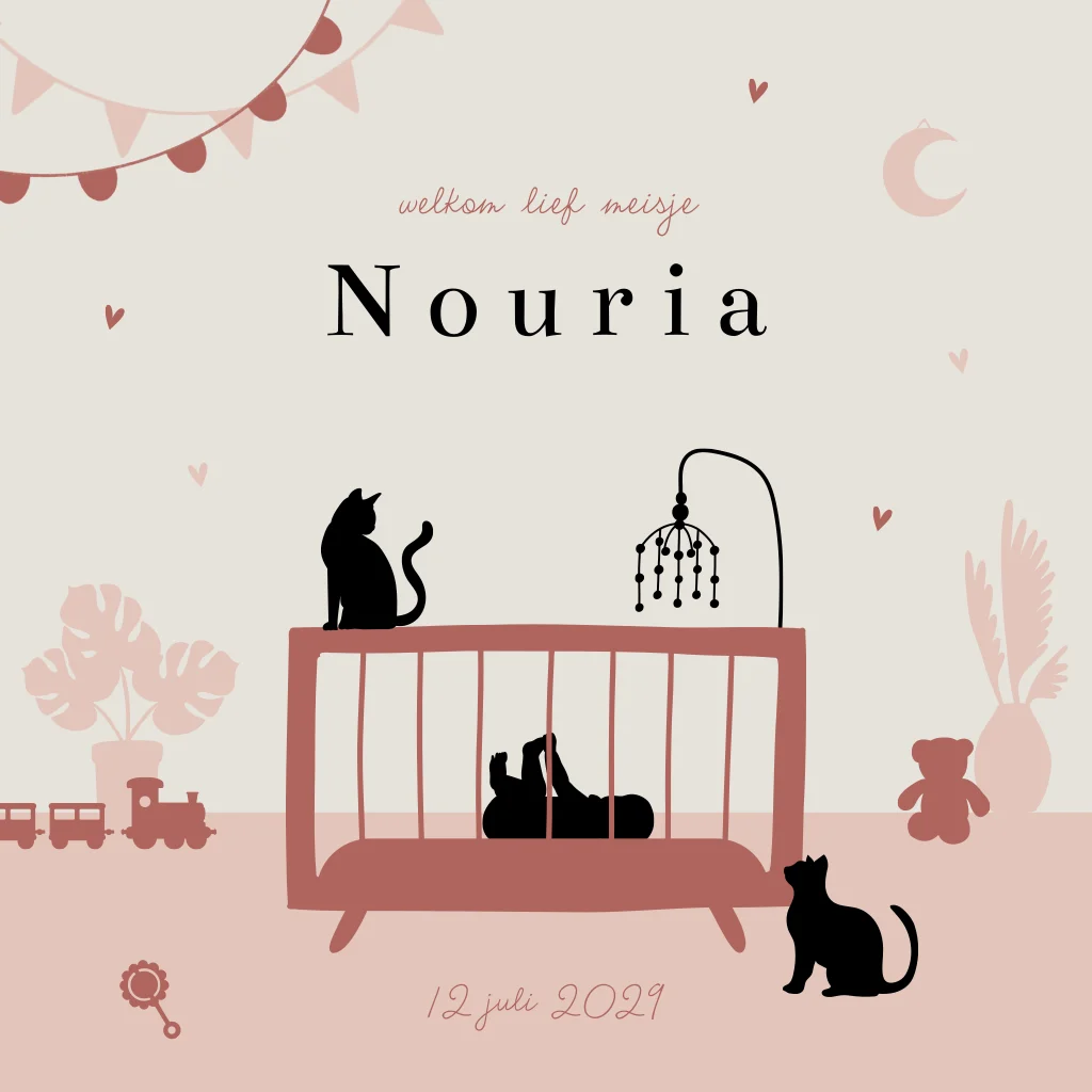 Geef je lieve kat(ten) een plekje op het geboortekaartje voor je aanstaande dochtertje met dit vrolijke, vierkante geboortekaartje. In een ledikantje ligt een silhouet meisje, omringt met speelgoed, slingertjes en planten in haar babykamertje. Twee nieuwsgierige katten komen even een kijkje nemen! Je kunt deze silhouet kaart personaliseren door je eigen huisdieren toe te voegen met onze editor. Zo kun je natuurlijk ook een hondje of konijn toevoegen.