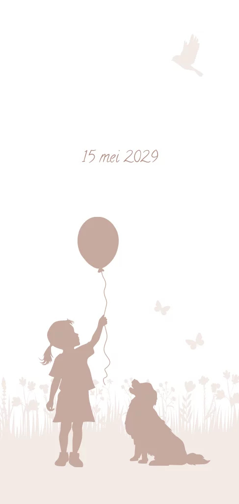 Laat dit betoverende geboortekaartje de komst van je kleine meisje aankondigen. Met een charmant silhouet van een meisje met een ballon en haar trouwe hond naast haar, vangt dit kaartje de magie en vreugde van het moment perfect. Een mooie manier om je geluk te delen met vrienden en familie. De naam van je dochtertje wordt in glimmend roségoud gedrukt, net als een aantal kleine hartjes. De subtiele kleuren zorgen voor een rustige uitstraling. Pas dit kaartje naar eigen wens aan in onze editor en bestel een proefdruk.