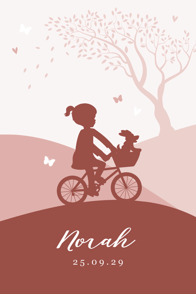 Lief geboortekaartje met een meisje op een fiets met een hondje in haar fietsmandje. Ze fietst door een roze landschap met een boom en kleine vlindertjes. De kaart wordt extra speciaal door de prachtige roségoudfolie en de afgeronde hoeken. Pas dit kaartje zelf aan in onze ontwerptool en bestel een proefdruk.
