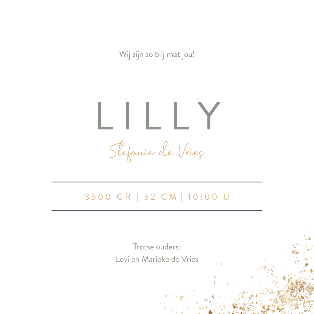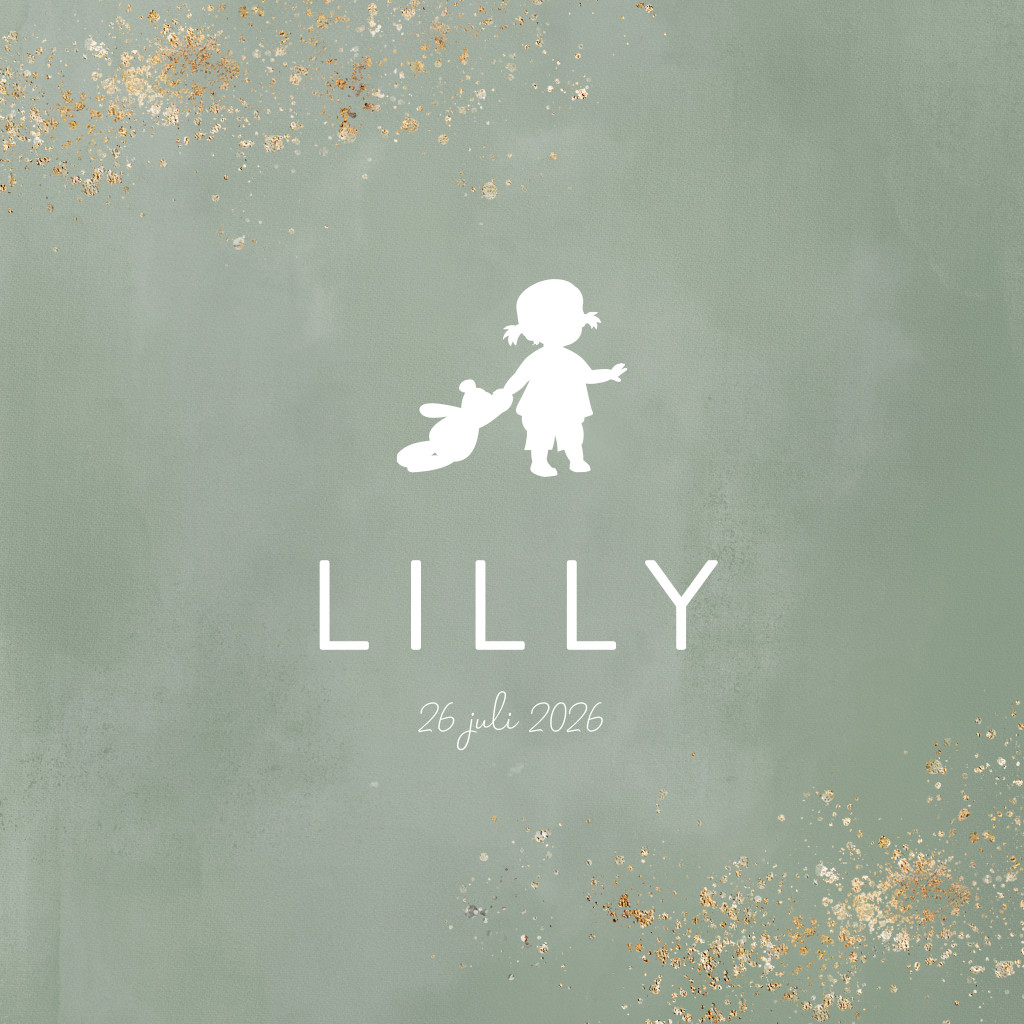 Groen geboortekaartje met wit silhouet en spetters. Vind jij stijlvolle geboortekaartjes net zo mooi als wij? Dan is dit chique geboortekaartje misschien wel een mooi ontwerp voor jou. Op de voorzijde zie grijsgroene waterverf omrand door gouden spetters. Het kleine meisje sleept een teddybeer achter zich aan. Pas het ontwerp naar wens aan in de ontwerptool.