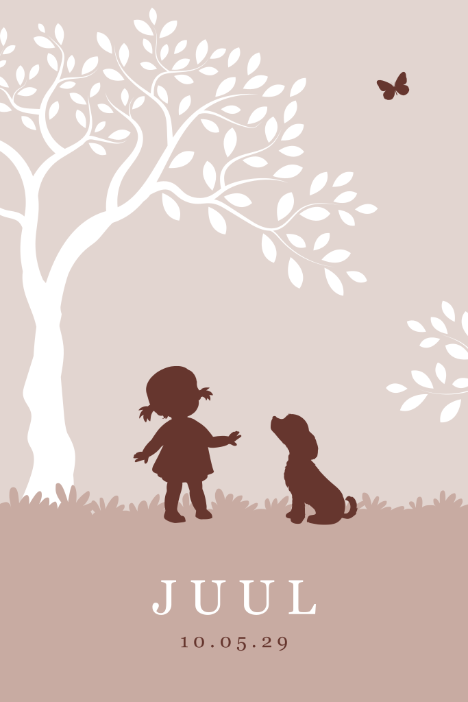 Zachtbruin geboortekaartje met silhouet meisje en hondje onder een grote boom. Een lief geboortekaartje om de komst van jouw pasgeboren dochtertje mee aan te kondigen! Zeker leuk wanneer je thuis een hond hebt rondlopen, geef deze een plekje op de geboorteaankondiging met dit vrolijke ontwerp. Een klein vlindertje maakt dit ontwerp helemaal af. Pas dit kaartje zelf aan in onze editor.