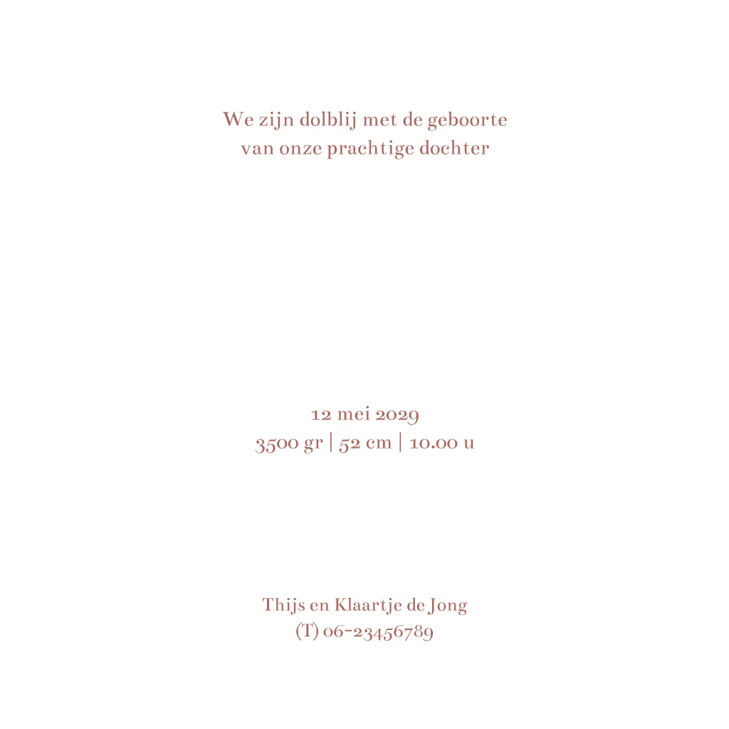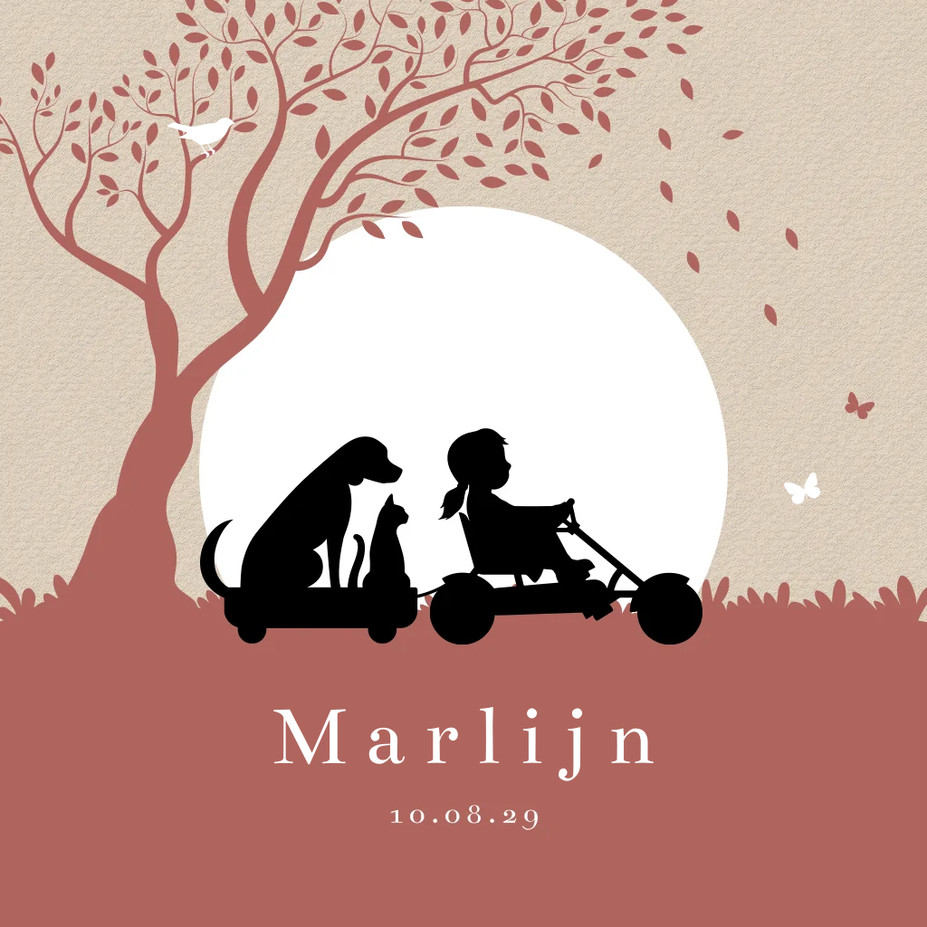 Verwacht je binnenkort een dochtertje? En heb je huisdieren die je graag terugziet op het geboortekaartje? Misschien is dit leuke silhouet ontwerp met meisje op een skelter iets voor jou! In het karretje achter de skelter kun je een hond, kat of allebei kwijt. Plaats je eigen huisdieren in het karretje met behulp van onze editor. Je vindt allerlei honden en katten in de mappen 'Silhouet honden' en 'Silhouet dieren'. De naam van je dochtertje komt in goudfolie letters onder de silhouetjes.