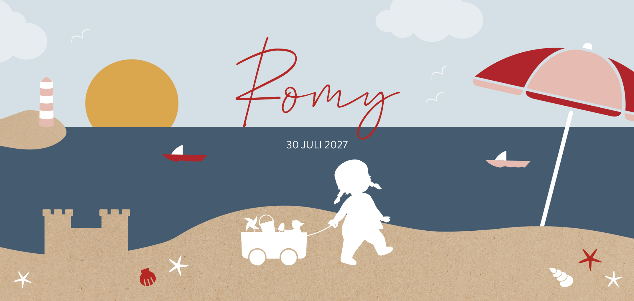 Woon je vlakbij het strand of ben je uitgerekend in de zomer? Kies dan voor dit vrolijke silhouet geboortekaartje waarbij je een meisje over het strand ziet lopen. Pas de teksten naar wens aan en bestel een proefdruk van dit kaartje zodat je deze in het echt kan bewonderen.