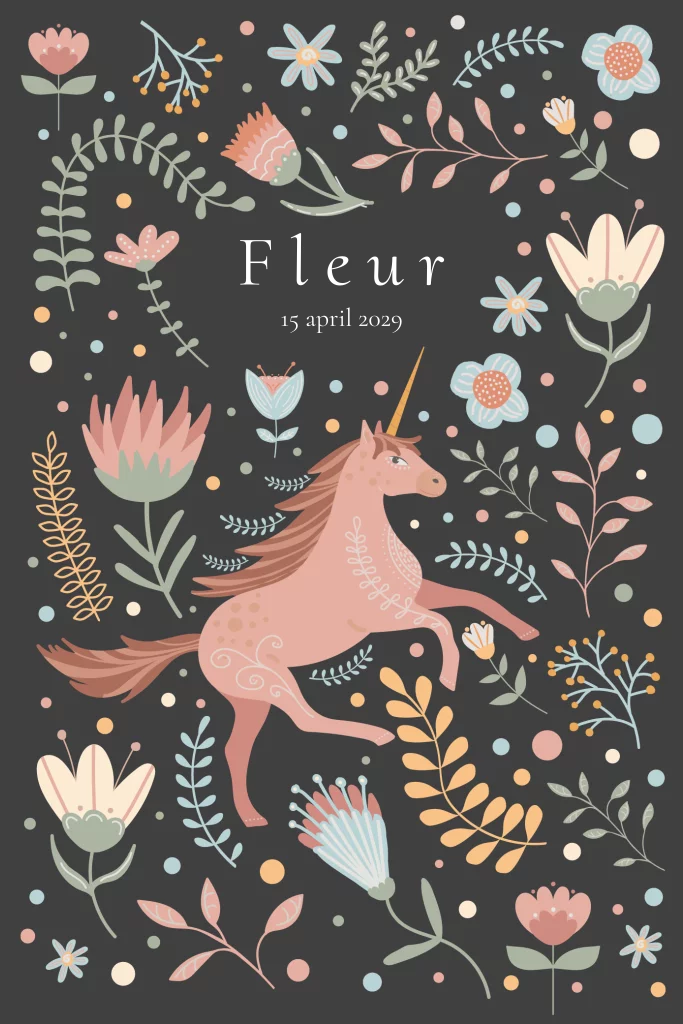 Magisch geboortekaartje met een roze eenhoorn tussen sierlijke bloemen en blaadjes op een donkergrijze achtergrond. De illustraties hebben een zachte retro-kleurstelling en geven het ontwerp een fantasierijke vintage uitstraling. Voor wie houdt van sprookjes en een tikkeltje mystiek.