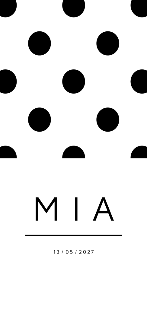 Simpel geboortekaartje met grote zwarte polka stippen in zwart/wit. Dit is een unisex geboortekaartje dat zowel voor een jongen als meisje kan. De kaart heeft een strakke, grafische uitstraling. Vind je dit geboortekaartje leuk? pas deze dan aan met de designtool en bestel een drukproef.