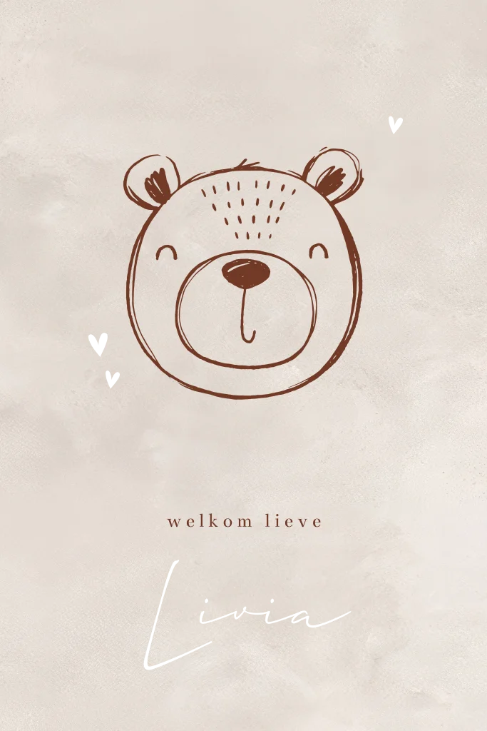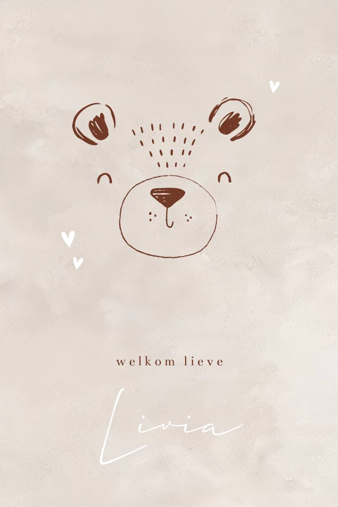 Beige geboortekaartje met bruine tekening van de snoet van een beer. De naam van je dochtertje wordt eronder gedrukt en mooi roségoudfolie. Pas dit hippe ontwerp eenvoudig aan met de designtool en bestel een drukproef, zo kun je eerst even zien hoe de kaart in het echt wordt.