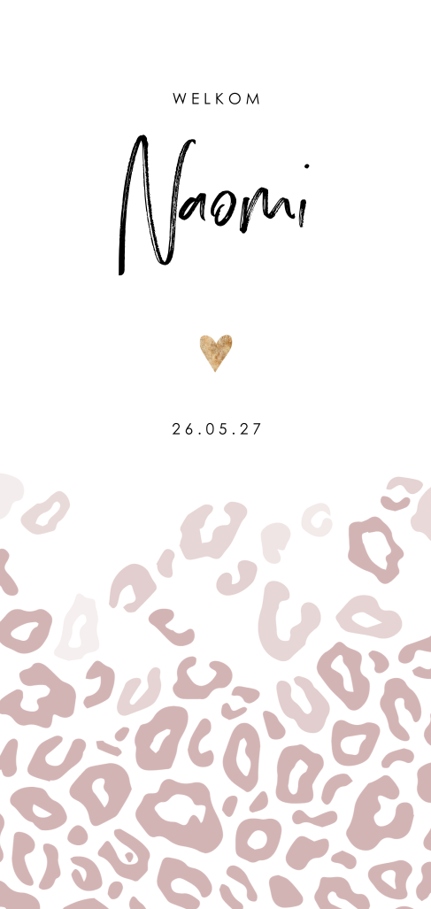 Op zoek naar een stoer geboortekaartje voor je pasgeboren dametje? Dan is dit een passend ontwerp voor jou. Dit kaartje is helemaal volgens de laatste trends en heeft een hippe panterprint in de kleur roze op de voor- en achterkant. Het goudkleurige hartje maakt het kaartje helemaal af. Pas de kleuren en lettertypes naar wens aan om het kaartje zo persoonlijk mogelijk te maken.