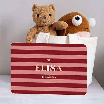 Hippe geboortekaart met horizontale strepen in roze en de naam en geboortedatum in roségoudfolie. Het ontwerp is gemakkelijk aan te passen via een online editor. Je kunt ervoor kiezen om de kaart te personaliseren en vervolgens een drukproef te bestellen om te zien hoe het uiteindelijke resultaat eruit zal zien.