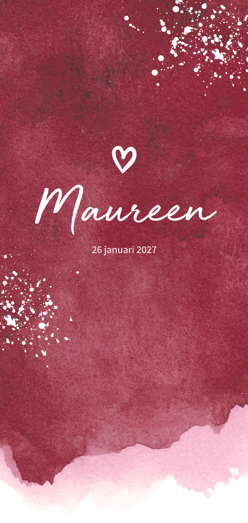 Trendy geboortekaartje met bordeaux waterverf en gouden spetters voor een meisje. Mooi, stijlvol geboortekaartje in langwerpig formaat. De kaart heeft de populaire bordeaux kleur en is versierd met gouden spetters. Met speelse en chique typografie staat voorop de naam van jullie lieve dochter. Achterop staat alle overige informatie.