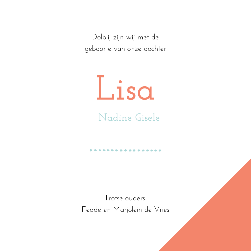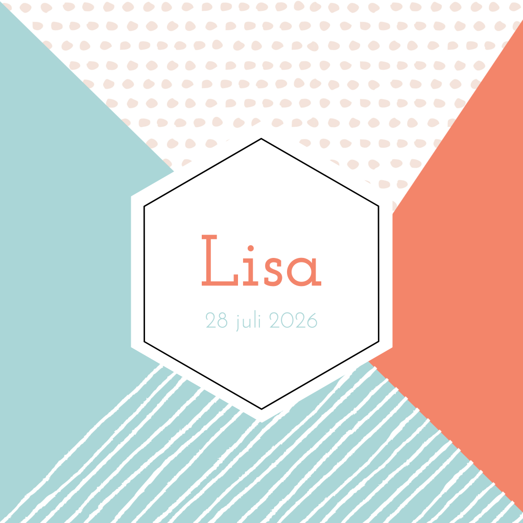 Is er een klein meisje op komst? Met dit kleurrijke geboortekaartje kondig je haar geboorte aan op een vrolijke manier. De grafische vlakken in koraalroze en lichtblauw zorgen voor een moderne uitstraling. Aan de binnenzijde is er ruimte voor een lief gedichtje of quote. Benieuwd hoe dit kaartje er gedrukt uit komt te zien? Bestel een proefdrukje.