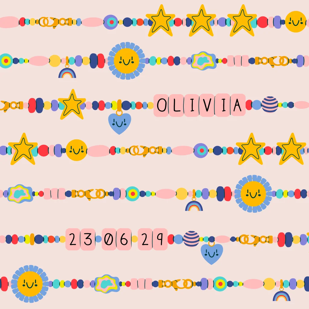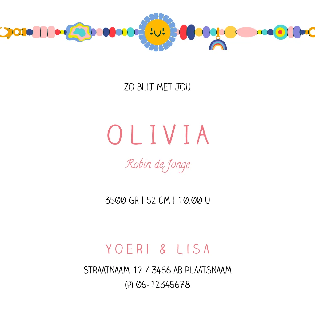 Een uniek en vrolijk geboortekaartje voor een meisje, met een kleurrijke kralen vol sterretjes, bloemetjes, hartjes en regenbogen. De naam en geboortedatum worden speels weergegeven in blokjes, alsof ze aan een kralenarmband hangen. Er is ruimte voor 8 blokjes voor de naam, maar dit kun je eenvoudig aanpassen in de editor – korter of langer, het ontwerp beweegt mee. Dit geboortekaartje straalt kleur, blijdschap en creativiteit uit – perfect voor een vrolijke en eigenwijze baby. Pas eenvoudig de naam en datum aan in onze editor en maak er jullie persoonlijke kaartje van.