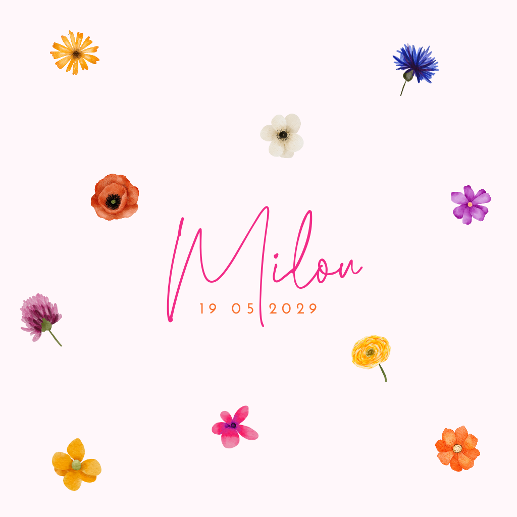 Verspreid de blijde boodschap van jullie dochter's geboorte met een zonnige geboortekaart! Dit enkele, vierkante ontwerp met ronde hoeken straalt met zijn kleurrijke losse bloemetjes. Elk bloemetje is uniek en brengt een feestelijke sfeer met zich mee. Maak de kaart moeiteloos met behulp van onze gebruiksvriendelijke editor en deel jullie vreugde op een persoonlijke manier.