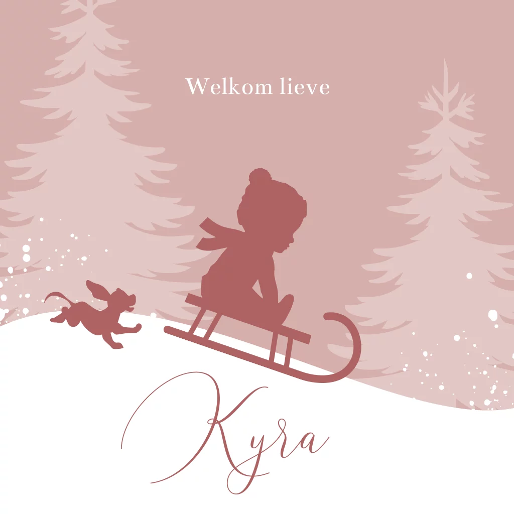 Verwachten jullie deze winter een meisje? Kies dan voor dit sfeervolle geboortekaartje met winterthema. Het ontwerp heeft een schattig silhouet in rozetinten van een meisje op een slee met een vrolijk hondje er naast. Personaliseer het kaartje eenvoudig in de designtool en bestel een drukproef om het eindresultaat te bewonderen.