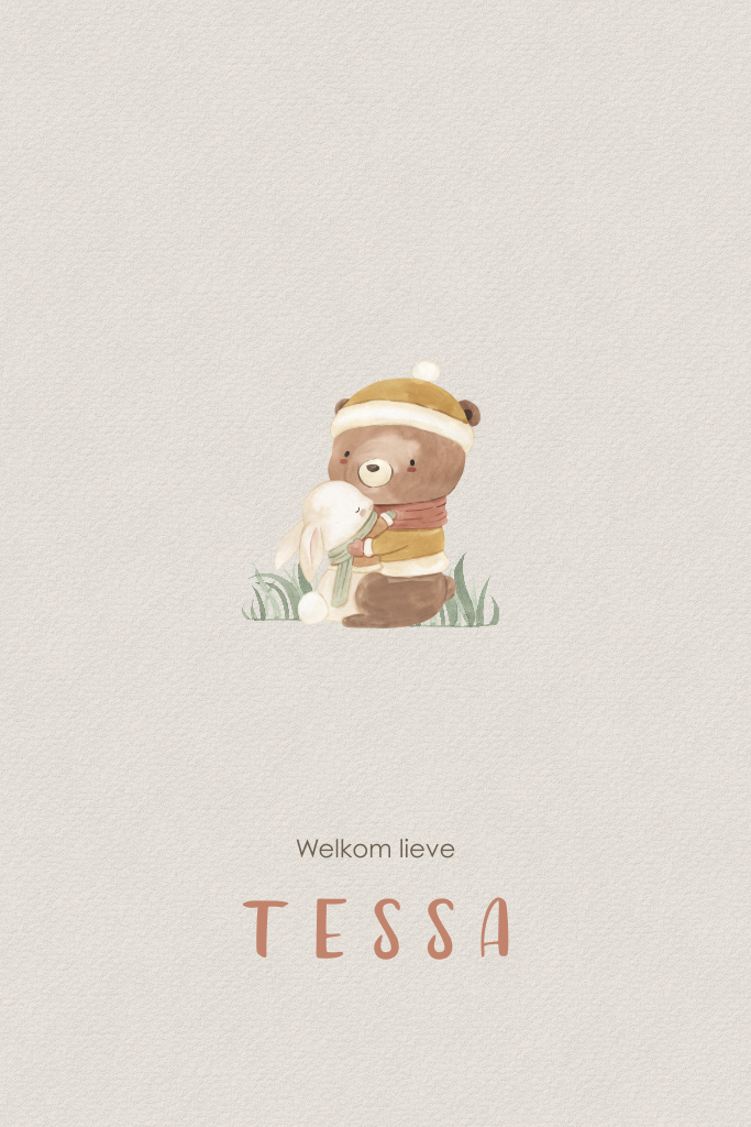 Schattig geboortekaartje met een lieve waterverf tekening van een beertje met een gele muts knuffelend met een konijntje. Pas deze kaart naar wens aan en bestel een drukproef.