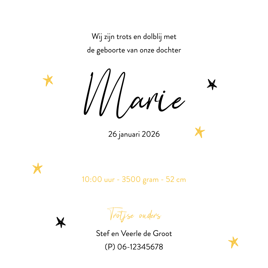 Is er een meisje op komst? Dit leuke geboortekaartje met pinguïn en sterren is perfect. Dit schattige geboortekaartje met illustratie van een pinguïn is geschilderd met waterverf. Ook dwarrelen er allerlei sterretjes om deze pinguïn heen. Deze sterretjes zijn ook op de rest van de kaart terug te vinden. In de kaart is ruimte voor de geboortegegevens en een mooie oneliner. Ook kun je eventueel een gedichtje toevoegen.