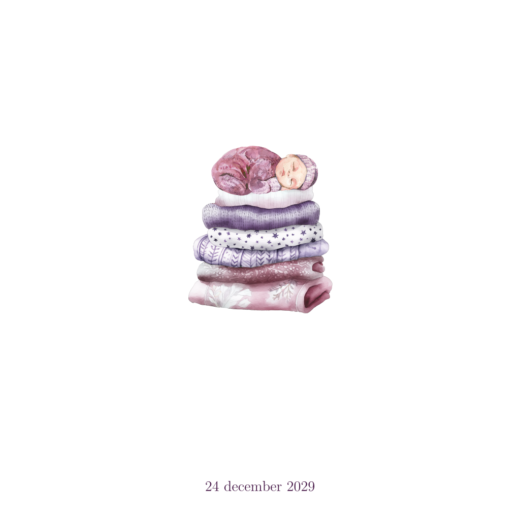 Geboortekaartje voor als je dochter deze winter geboren wordt, misschien wel rond kerst. Op dit lieve kaartje staat een stapel met warme dekens waarop een lief klein baby meisje ligt te slapen. Er staan kleine roségoudfolie sterretjes omheen en de naam eronder staat ook in dezelfde kleur folie. Achterop staan de geboortegegevens met leuke kleine icoontjes als een trui, muts en een sjaal. Pas het ontwerp eenvoudig aan met de editor en vraag een drukproef aan.