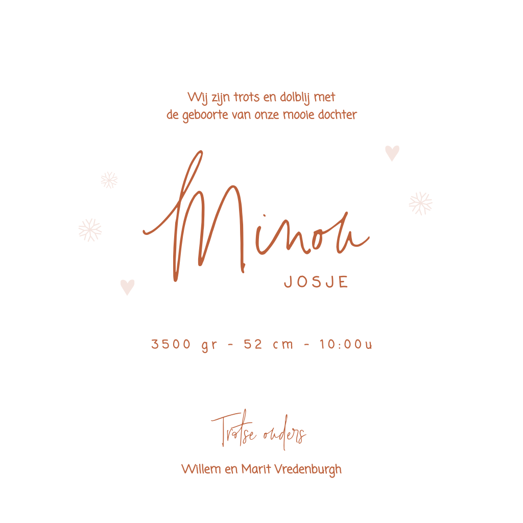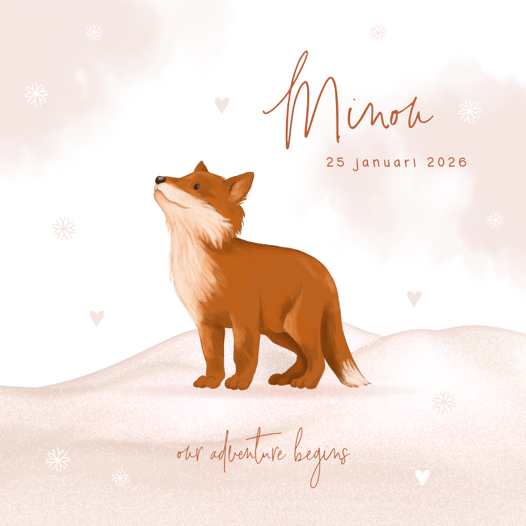 Een schattig geboortekaartje voor een winterkindje. Op de voorkant van dit vierkante kaartje staat een lief vosje in de sneeuw. In de kaart keert het vosje terug, dit keer slapend. Links is ruimte voor een mooie quote of gedichtje en rechts is ruimte voor alle geboortegegevens van je dochtertje. Pas deze kaart naar eigen wens aan in onze handige ontwerptool.