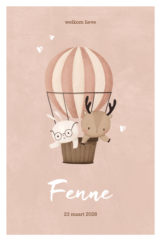 Zachtroze geboortekaartje met luchtballon en lieve diertjes