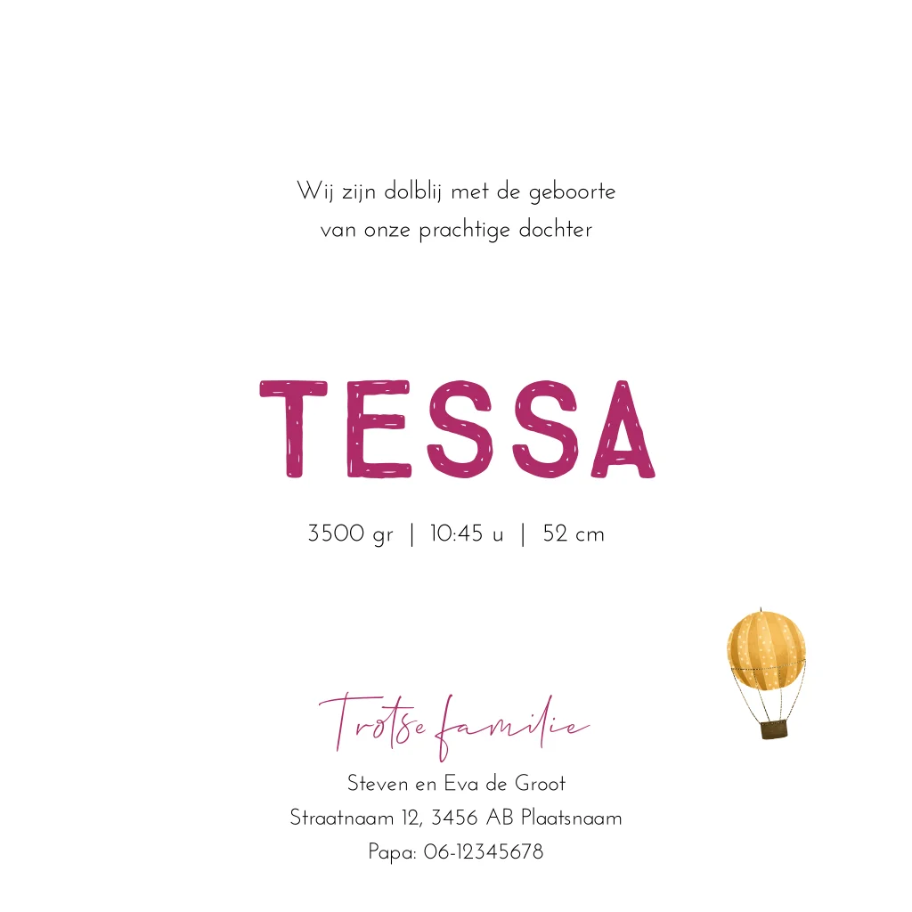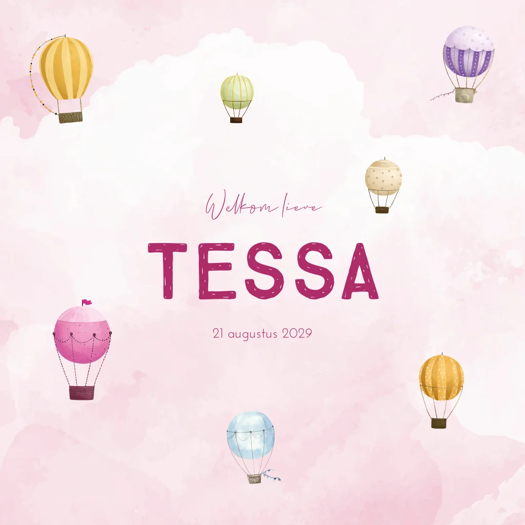 Dit schattige geboortekaartje brengt een vleugje magie met zich mee. De achtergrond is een zachtroze lucht met witte wolken, omringd door kleine luchtballonnen in diverse kleuren. In het midden staat de naam van jullie pasgeboren dochtertje. Pas de kaart eenvoudig aan met onze editor en bestel een proefdruk om het resultaat te zien!