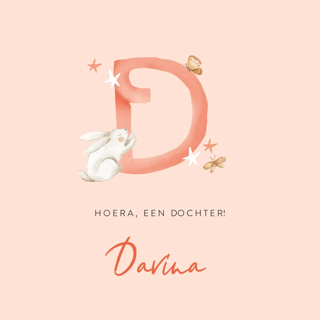 Zalmroze geboortekaartje met konijn, vlinder en initiaal
