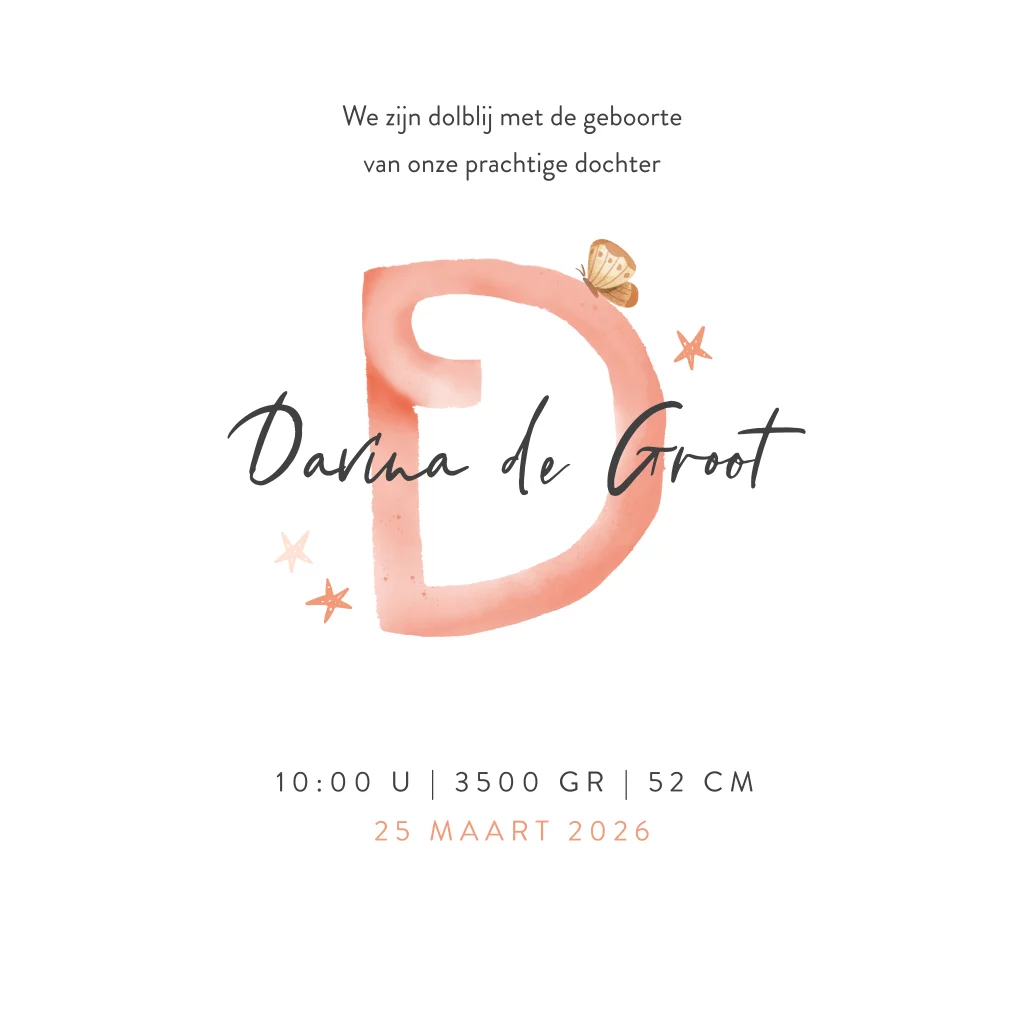 Op zoek naar een vrolijk, maar eenvoudig ontwerp voor het geboortekaartje van je dochter? Wat dacht je van dit zalmroze geboortekaartje met konijntje en gekleurd initiaal? Extra leuk aan dit ontwerp is dat je de letters en achtergrond van kleur kunt veranderen. Zo kun je het kaartje gemakkelijk personaliseren. De diertjes rondom het initiaal maken het ontwerp helemaal compleet.