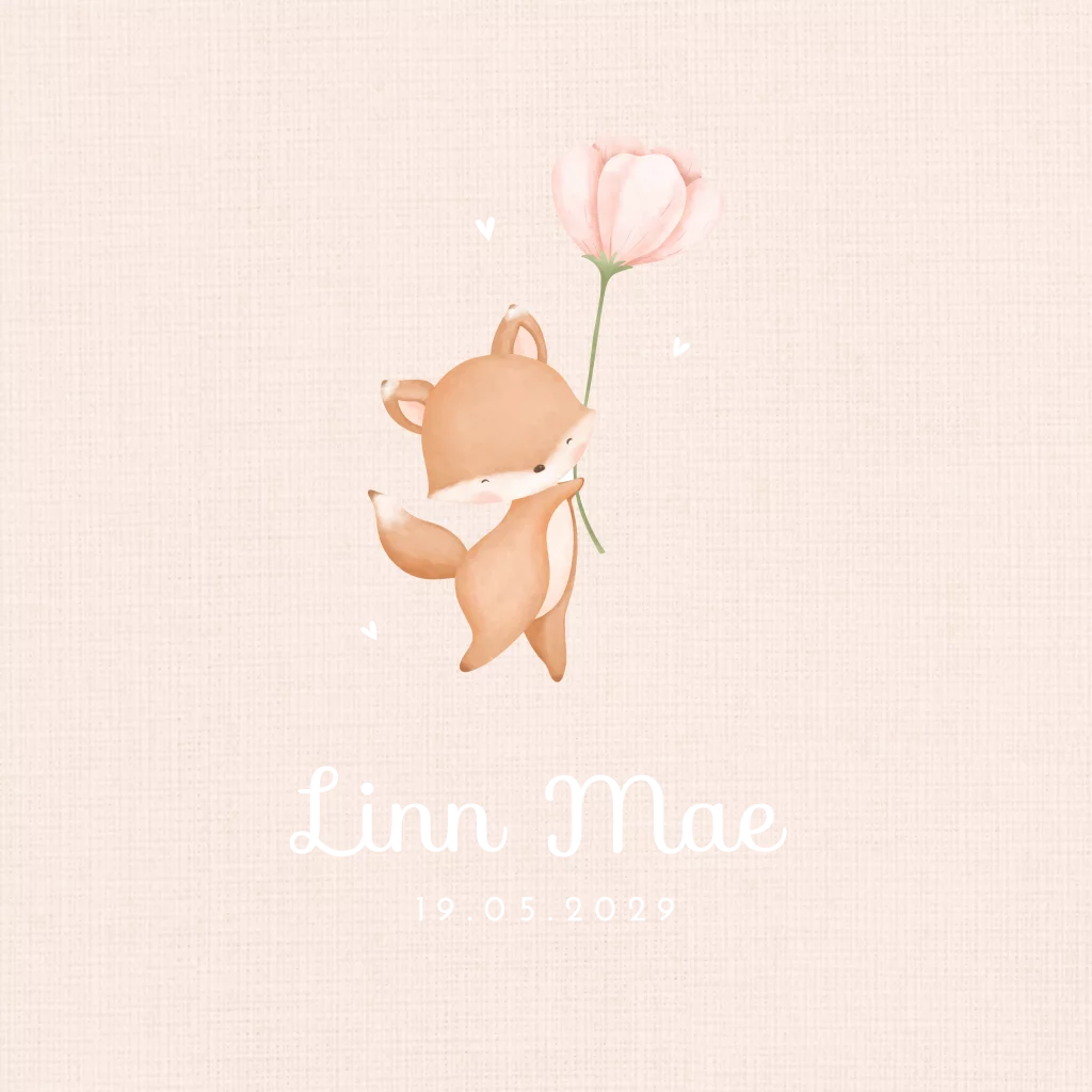 Ontzettend lief geboortekaartje met schattig vosje en roze bloem. De naam van je dochtertje komt in roségoudfolie voorop. Liever een andere kleur folie? Pas dit eenvoudig aan in onze handige editor.