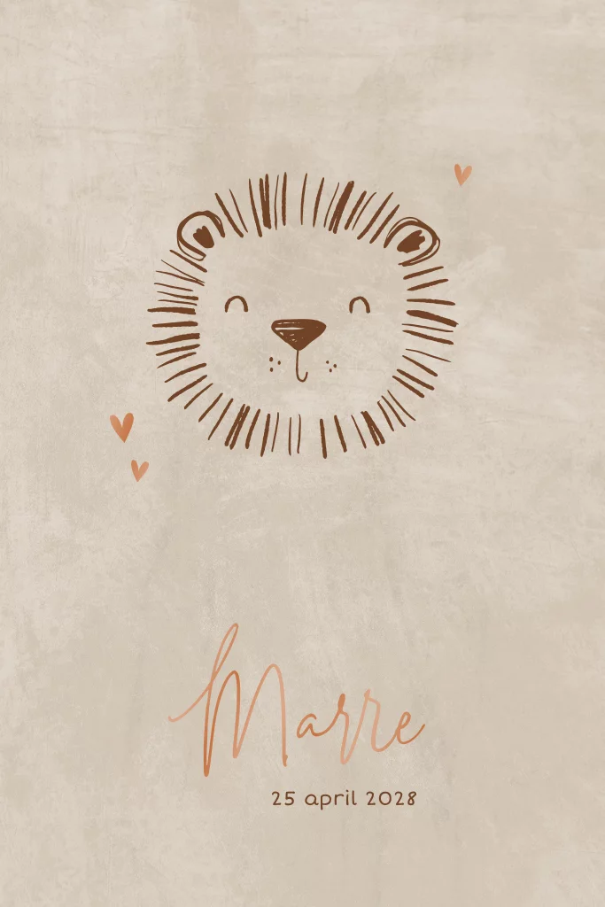 Zandkleurig geboortekaartje met donkerbruine illustratie van een leeuw en de naam in mooi hoogglans. Hou jij van een minimalistisch geboortekaartje maar wil je toch een stoer uiterlijk? Dit beige geboortekaartje heeft een subtiele tekening van een leeuw in het midden, met lieve hartjes eromheen. Met speelse lettertypes staan de naam en datum in glimmend hoogglans.