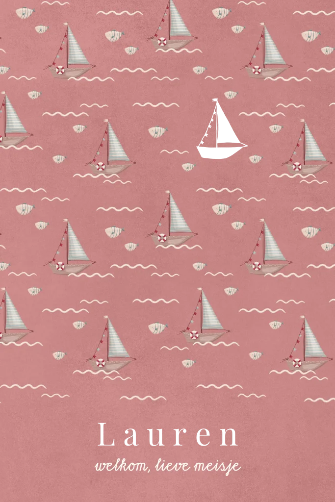 Op zoek naar een maritiem geboortekaartje voor jouw aanstaande dochtertje? Kondig haar komst aan met dit donkerroze geboortekaartje met bootjes, visjes en goudfolie! Eén van de bootjes plus de naam van je dochtertje worden in goudfolie gedrukt. Pas deze kaart zelf aan in onze editor.