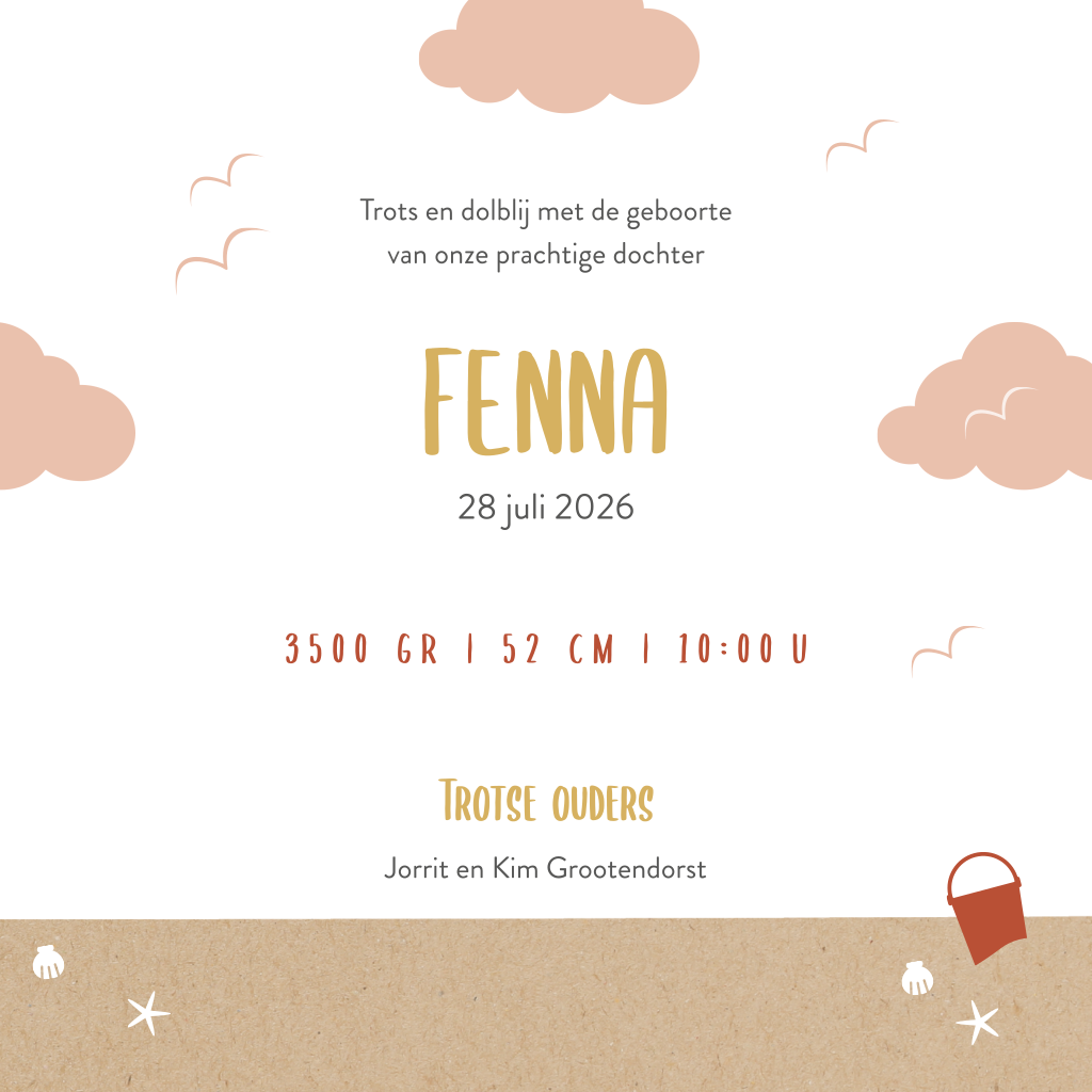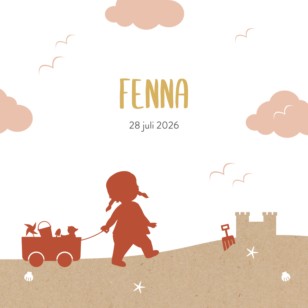 Zomer geboortekaartje met silhouet meisje op het strand. Verwacht jij jouw kleine meid in de zomer? Dan is dit een leuk geboortekaartje voor jou. Dit hippe ontwerp heeft een witte achtergrond met een meisje met een strandkar voorop. Zeesterren, schelpen en zandkastelen maken het ontwerp helemaal af. In de kaart is ruimte voor een mooie tekst en de geboortegegevens. Pas het ontwerp naar eigen voorkeur aan en bestel een drukproef.