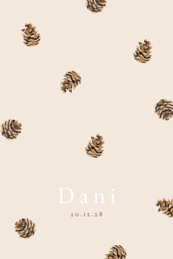 Trendy, beige geboortekaartje met een patroon van kleine dennenappeltjes. De naam van je kindje komt in goudfolie letters onder de dennenappels te staan. Dit eenvoudige, maar stijlvolle patroon past perfect bij een kindje dat in de herfst of winter geboren wordt! Liever een andere kleur achtergrond? Pas dit kaartje naar eigen smaak aan in onze handige ontwerptool en bestel een proefdruk.