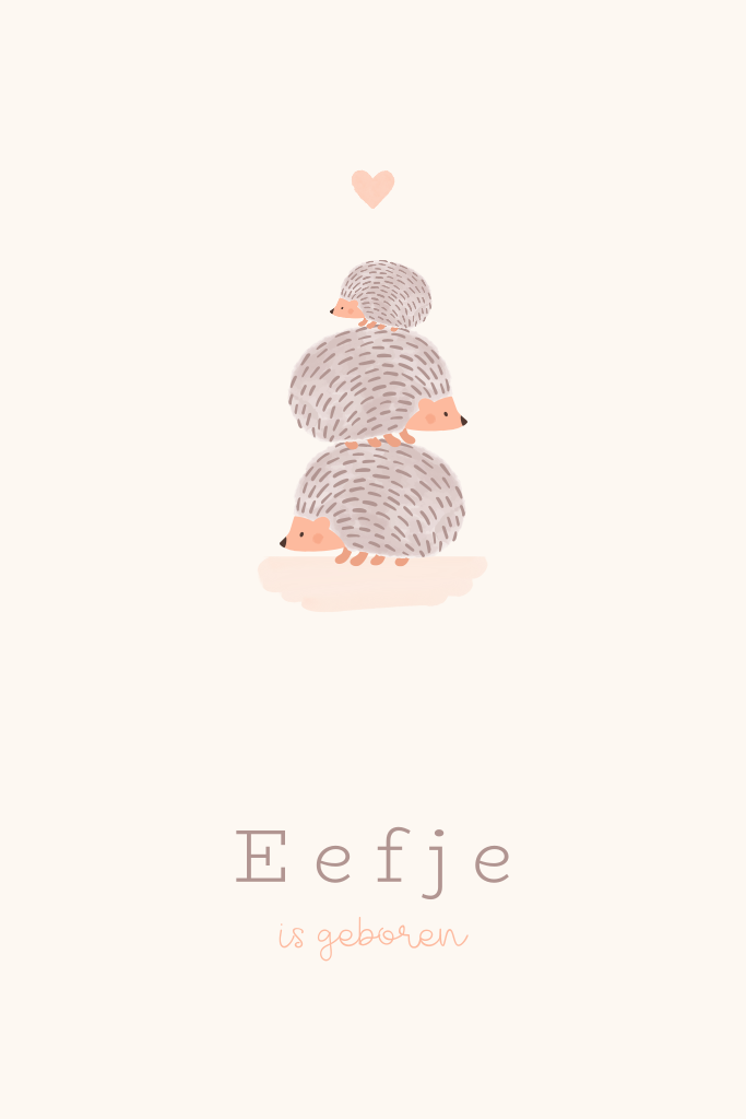 Verwacht je een herfstkindje? Kondig zijn of haar komst aan met dit lieve geboortekaartje met egeltjes familie. Drie egeltjes staan op elkaar gestapeld op de voorkant, op de achterkant lopen ze in een rijtje achter elkaar. Liever andere kleuren? Geef je eigen draai aan dit schattige geboortekaartje in onze editor. Bestel een proefdruk om dit kaartje in het echt te kunnen zien.