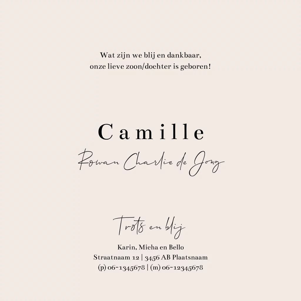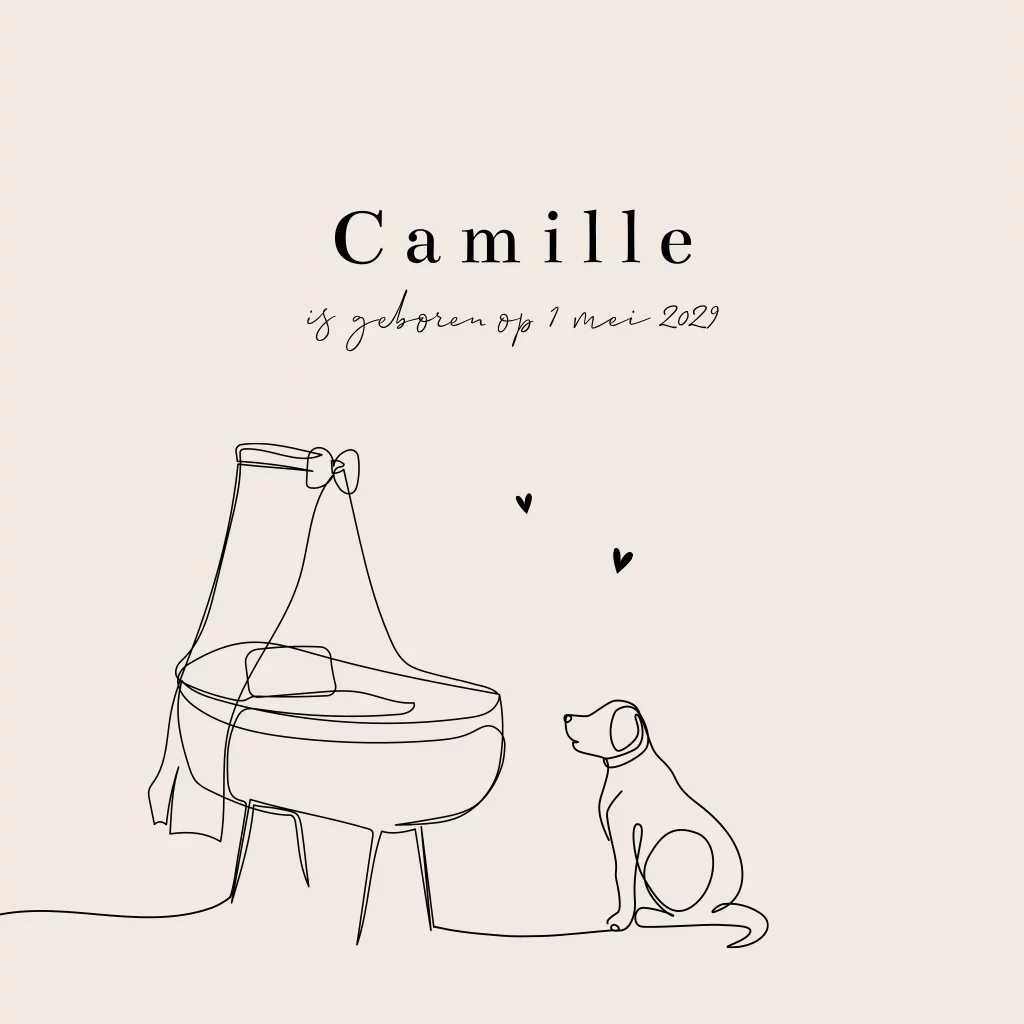 Heb je een trouwe viervoeter thuis en verwacht je een zoon of dochter? Kondig de komst van je kindje aan met dit lieve beige geboortekaartje met een simpele, zwarte lijntekening van een hond en een wiegje. De kaart wordt verder versierd met kleine hartjes. Liever een andere achtergrondkleur of de lettertypes wijzigen? Pas dit geboortekaartje zelf aan in onze gebruiksvriendelijke editor.