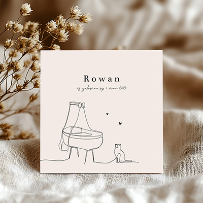 Beige geboortekaartje met getekende wieg en poes