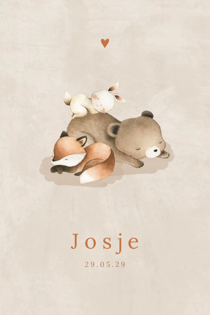 Een beertje, vosje en konijntje liggen lief te slapen op dit beige geboortekaartje met roestbruine naam en hartje. Dit beige geboortekaartje voor zowel een jongen als meisje een lieflijke geboorte aankondiging. Een slapend eekhoorntje komt op de achterkant, samen met de geboortegegevens van je kleine. Dit ontwerp is volledig te personaliseren in onze handige editor.