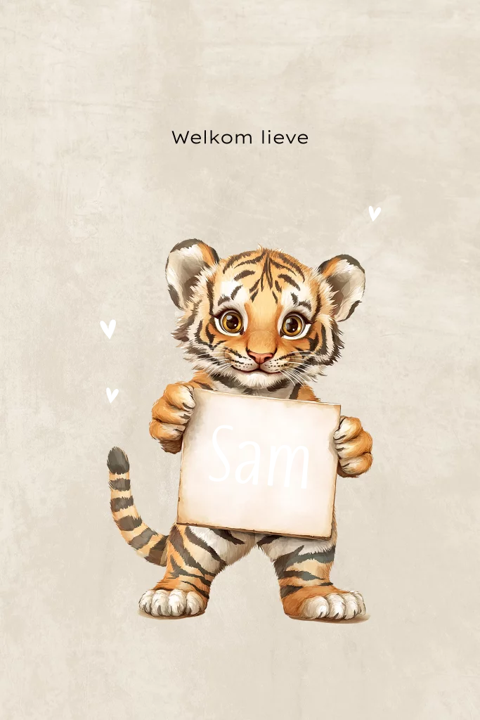 Wat een stoer geboortekaartje met deze vrolijke tijger die een naambordje vasthoudt met daarop de naam van je pasgeboren kindje. het ontwerp is geschikt voor zowel een jongen als een meisje. De goudfolie naam en hartjes maken het ontwerp helemaal af. Pas het kaartje naar eigen inzicht aan met de editor en bestel een drukproef. Heb je onze andere ontwerpen met tijgertje al gezien?