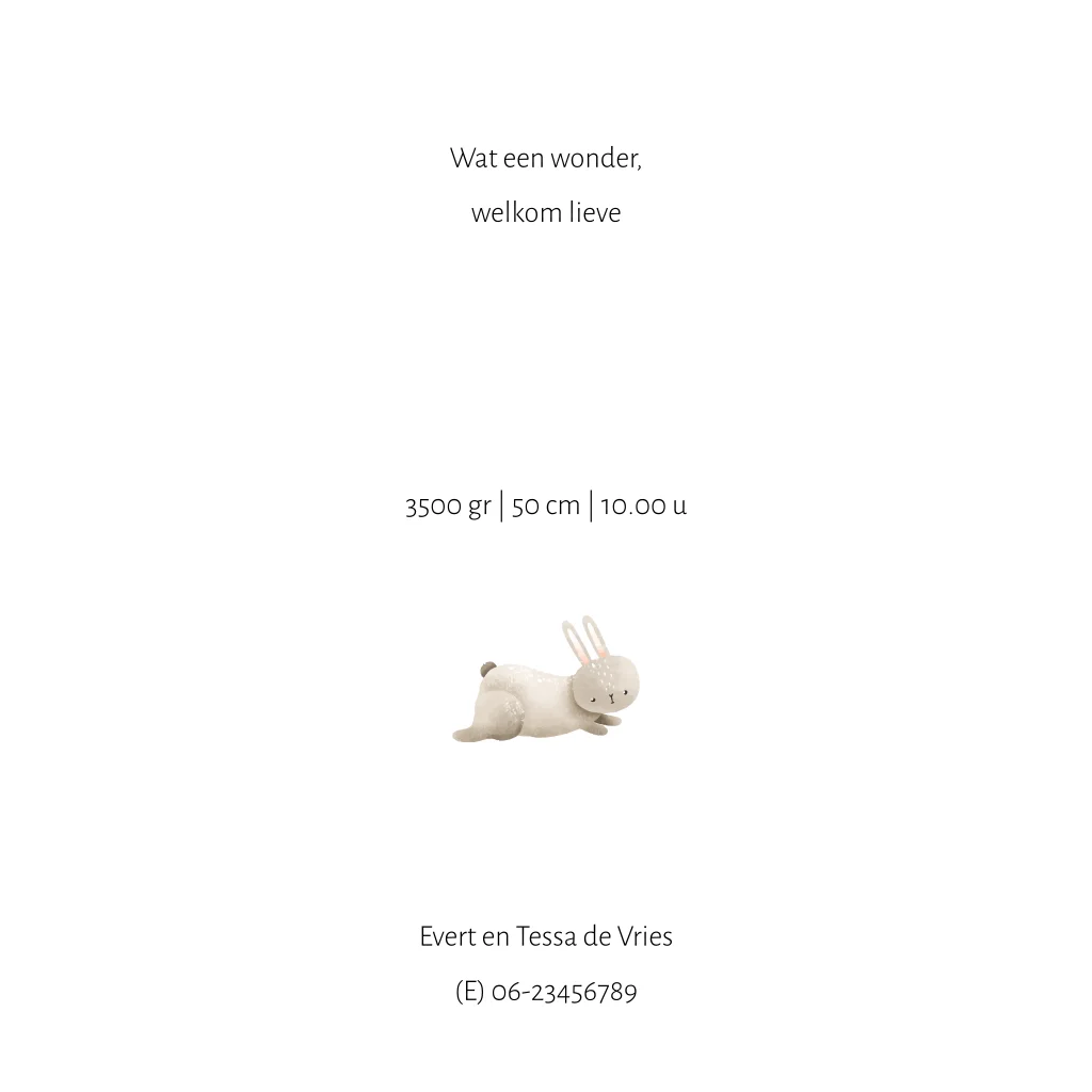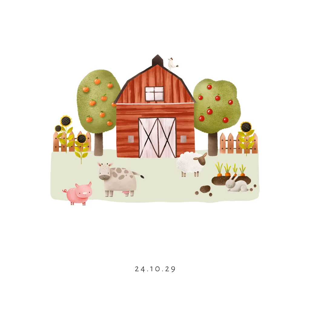 Vrolijk geboortekaartje met boerderij, fruitbomen en leuke boerderijdieren die grazen in de wei. In koperfolie komt de naam van je kindje onder dit gezellige tafereeltje. Aan de binnenzijde van dit vierkante kaartje komen de kleurrijke illustraties terug en kun je de geboortegegevens van je kleintje plaatsen. Liever een ander lettertype of toch hoogglans in plaats van koperfolie? Pas dit kaartje zelf aan in onze editor en bestel een proefdruk.