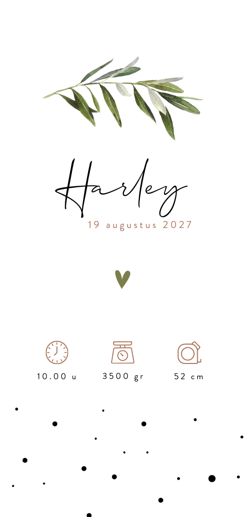 Op zoek naar een stijlvol geboortekaartje voor je pasgeboren kindje? Ga dan voor dit botanische kaartje met geschilderd olijftakje en stipjes. De achterkant van deze enkele kaart is geheel bruin. Op de voorkant staan drie icoontjes (in dezelfde tint) waaronder je de geboortegegevens van je kindje kunt plaatsen. Een mooi en rustig geboortekaartje om de komst van je kleine te vieren!