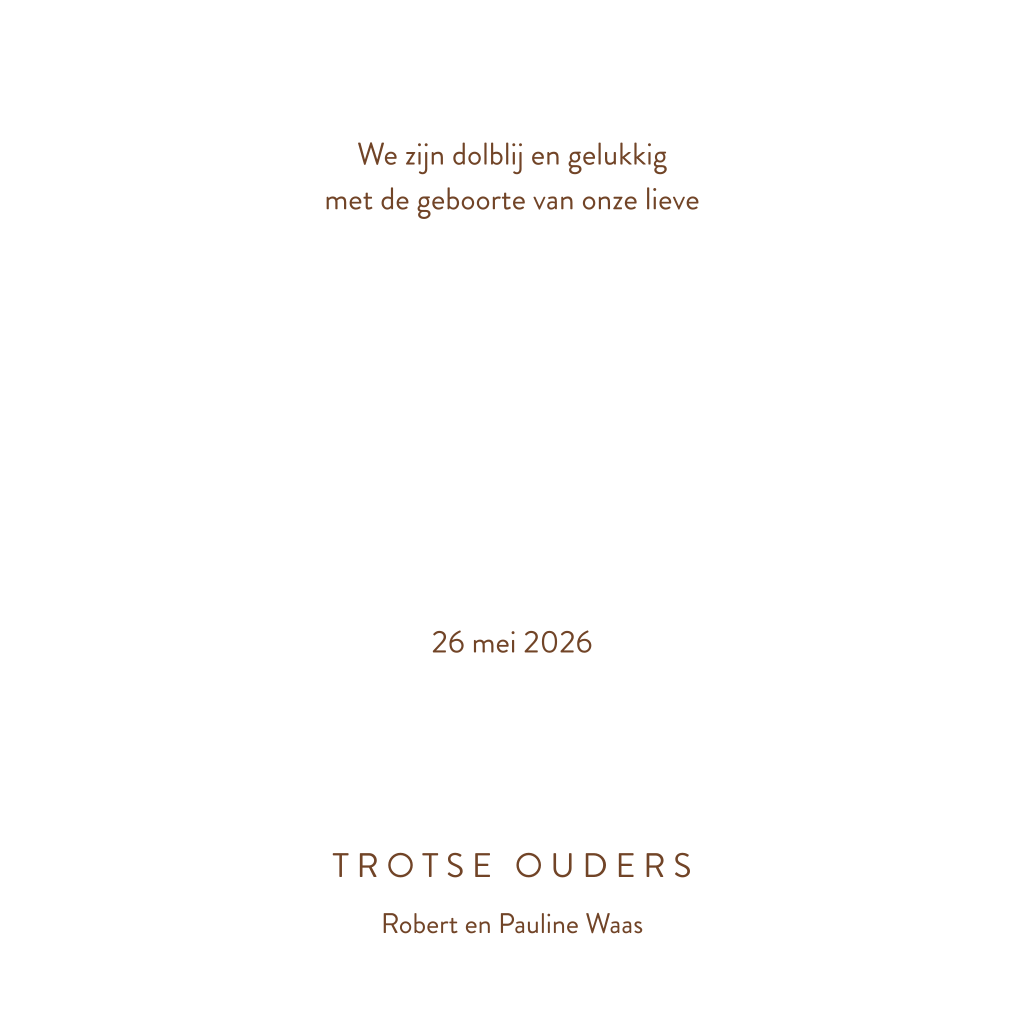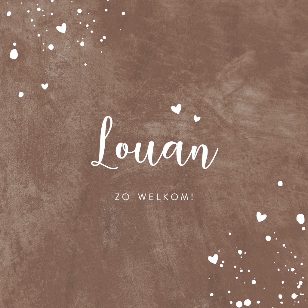 Bruin geboortekaartje met goudfolie spetters en hartjes. Op zoek naar een stijlvol geboortekaartje voor de geboorte van jullie kindje? Neem eens een kijkje bij deze mooie kaart. De kaart heeft een voorzijde van bruine waterverf. De goudkleurige spetters en hartjes geven de kaart een speelse uitstraling. Met de vrolijke typografie staat de naam op de voorzijde. Liever andere typografie? In de ontwerptool pas je dit kaartje gemakkelijk aan.