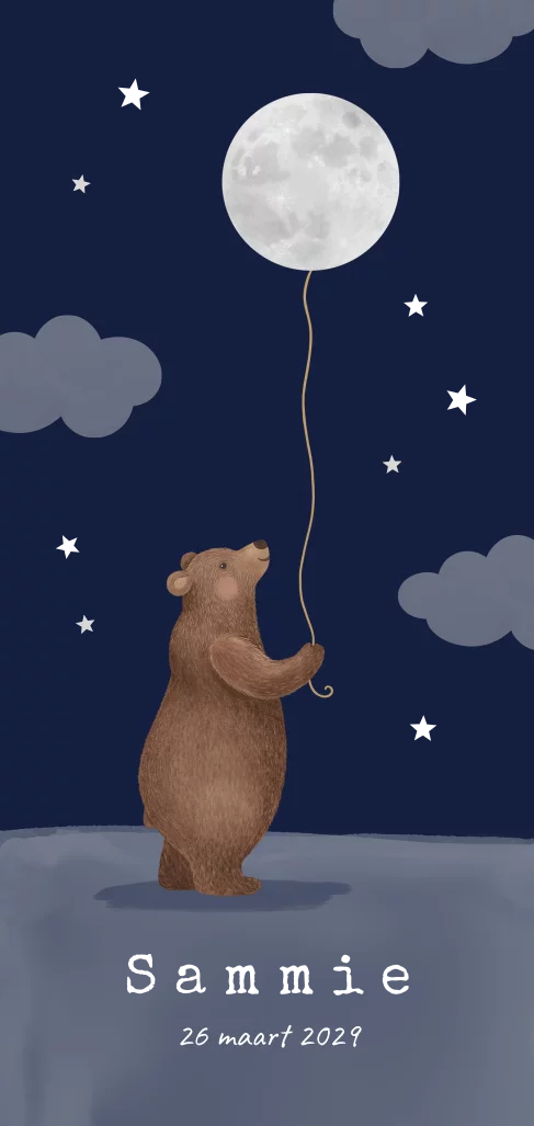 Verwelkom je kleine avonturier met dit betoverende donkerblauwe geboortekaartje. Op de voorkant staat ee lieve beer met de maan aan een touwtje, een dromerig tafereeltje. Eenvoudig en toch betoverend, dit kaartje is een perfecte manier om de komst van je kleintje te delen met vrienden en familie. De goudfolie naam en sterretjes maken het geheel helemaal af in stijl. Liever koperfolie of de lettertypes wijzigen? Geef je eigen draai aan dit geboortekaartje met onze editor en bestel een proefdrukje.