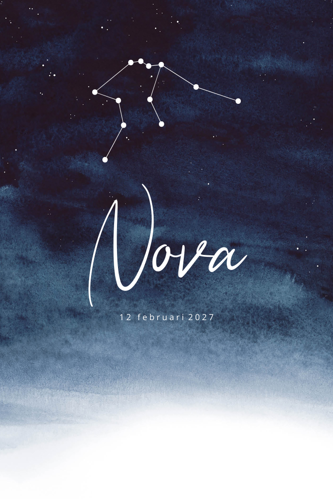 Donkerblauw waterverf geboortekaartje met goudfolie sterrenbeeld. Een minimalistisch geboortekaartje met een donkerblauwe waterverf en sterrenhemel, met sierlijk lettertype is dit een droomkaartje. Door de donkere achtergrond valt de naam van het pasgeboren kindje goed op. De illustraties en de naam word met goudfolie gedrukt. (dit kun je aanpassen in een andere kleur folie)