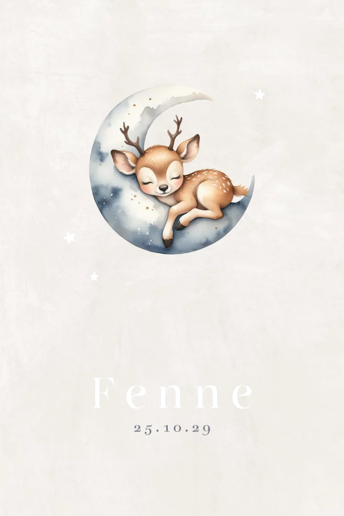 Dromerig en lief geboortekaartje met een schattig slapend hertje op een halve maan. De kaart wordt verder versierd met prachtig goudfolie. Kondig de komst van je kleine aan met dit lieve geboortekaartje. Liever een ander lettertype of de foliedruk van kleur veranderen? Open dit kaartje in onze handige editor en geef er je eigen creatieve draai aan. Bestel een proefdruk om dit kaartje in het echt te kunnen bewonderen.