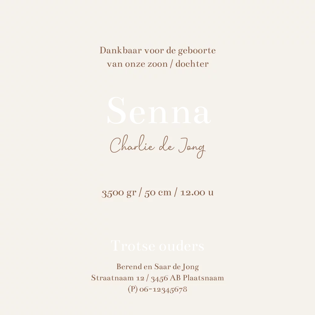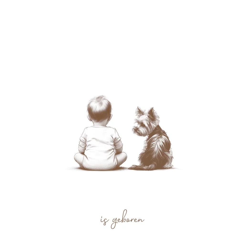 Dit geboortekaartje toont een lieve illustratie van een baby in wit van achteren gezien, met naast hem/haar een yorkshire terrier die opzij kijkt, beiden in bruine tinten. De naam en hartjes zijn in goudfolie voor een klassieke uitstraling. Eenvoudig, teder en tijdloos. Pas de kaart naar wens aan met de editor.