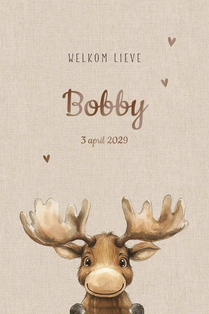 Verwelkom jullie zoon met dit stoere en lieve geboortekaartje met hert. Het getekende hertje met groot gewei staat vrolijk op een rustige beige achtergrond met linnenlook. Subtiele hartjes in hoogglans gedrukt maken het ontwerp speels en warm. Dit geboortekaartje met hert is eenvoudig te personaliseren met eigen teksten, kleuren en lettertypes in onze editor. Bestel een proefdruk en ervaar zelf hoe stijlvol dit kaartje is om de geboorte van jullie kindje aan te kondigen.