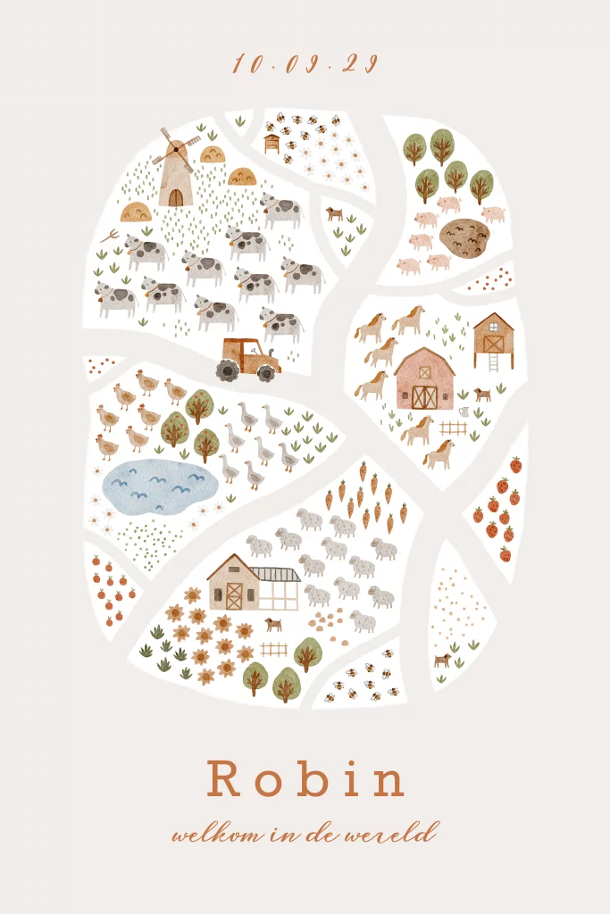 Een beige geboortekaartje met plattegrond van een boerderij met allerlei lieve diertjes en een traktor. De naam van je kindje komt in roestbruin voorop. Op de achterkant komen verschillende boerderijdieren terug: een varkentje, gansjes, haan en schaapje. Pas deze kaart zelf aan in onze ontwerptool.