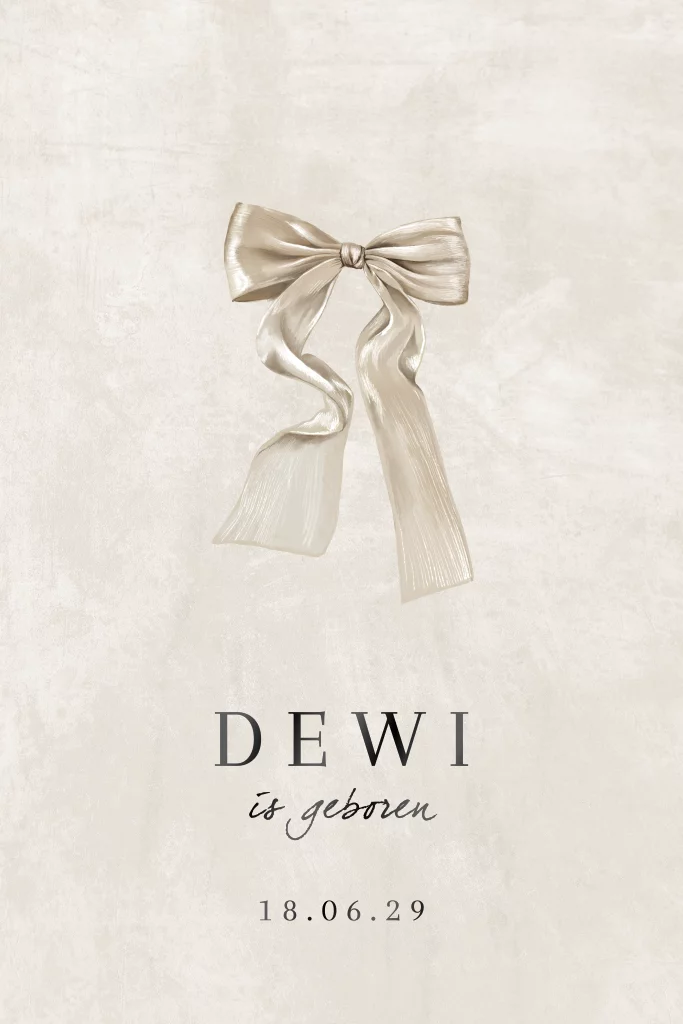 Moderne, staande geboortekaart met afgeronde hoeken, uitgevoerd in een warme beige tint. De grote strik voorop geeft de kaart een trendy en feestelijk accent. De tekst is in zwart hoogglans en voegt een luxe uitstraling toe. Het ontwerp kan volledig naar wens worden aangepast in onze online editor. Is hij naar je zin dan bestel je een drukproef om hem in het echt te zien.
